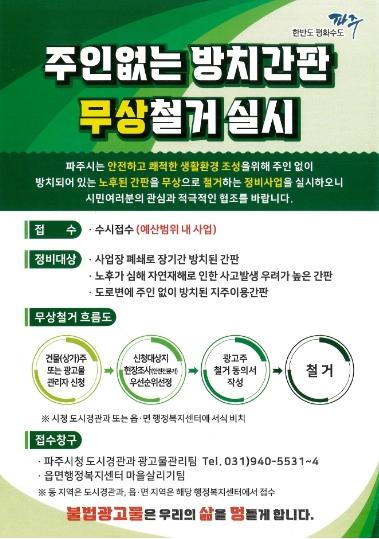최종환 파주시장은 “방치된 간판에 대한 지속적인 정비를 통해 시민의 생활 속 안전 수준 향상에 힘쓰겠다”고 전했다.