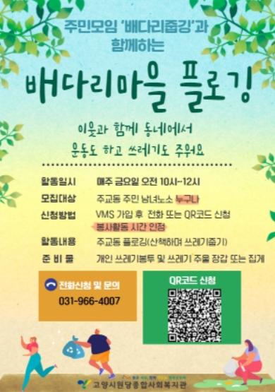고양시원당종합사회복지관(관장 황의철)은 배다리마을(주교동)에서 주민모임 ‘배다리줍깅’과 함께 지난 22일 플로깅(조깅하면서 쓰레기를 줍는 활동)을 진행했다고 밝혔다.