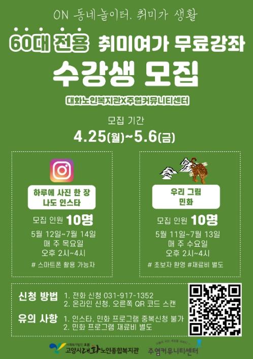 복지관은 주엽커뮤니티센터와 협약을 맺고 취미여가와 동아리 활동 공간을 지원받아 초기 노령층인 60대를 대상으로 ‘매일 한 장 나도 인스타’와 ‘우리 그림 민화’ 프로그램을 운영할 예정이다.
