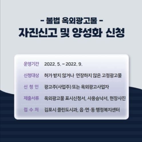 김포시 클린도시사업소는 허가 및 신고를 거치지 않고 설치한 불법광고물을 대상으로 오는 5월 1일부터 9월 30일까지 ‘불법광고물 한시적 양성화’를 추진한다고 밝혔다.