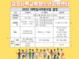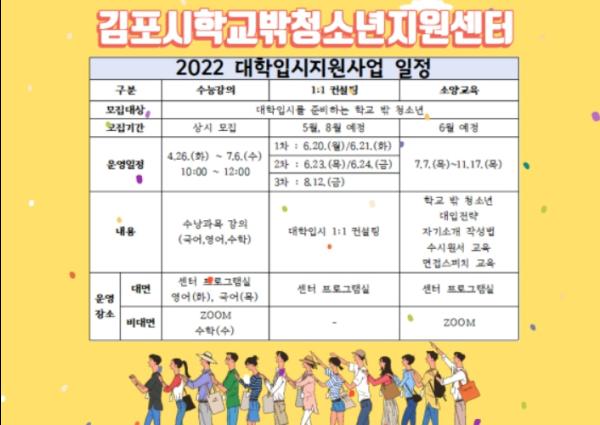김포시청소년재단 학교밖청소년지원센터에서는 관내 학교 밖 청소년의 상급학교 진학 지원을 목적으로 하는 '22년 대학입시 지원사업'을 4월 26일부터 시작한다.