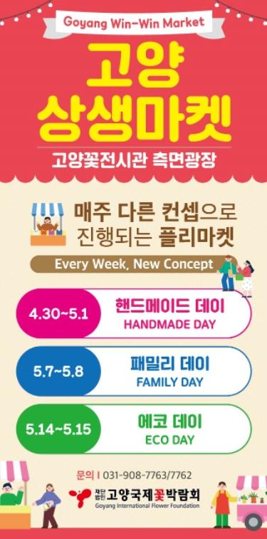 (재)고양국제꽃박람회(대표이사 김운영)는 일산호수공원 고양꽃전시관 인근 광장(측면 광장)에서 4월 30일부터 5월 14일까지 매주 주말(토·일요일) 고양시 내 협동조합·소상공인이 참여하여 다양한 화훼류 관련 상품을 판매하는 고양 상생(win-win)마켓을 연다고 밝혔다.