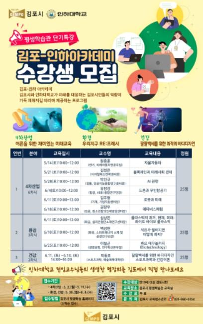김포시는 인하대와 함께 교육협력 사업의 일환으로 5월 14일부터 6월 25일까지 단기특강 '김포-인하아카데미' 프로그램을 운영한다고 밝혔다.