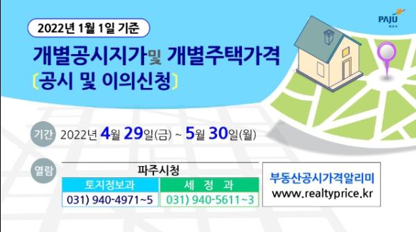 파주시는 2022년 1월 1일 기준 개별주택가격을 4월 29일 결정·공시하고, 5월 30일까지 이의신청 기간을 운영한다고 밝혔다.