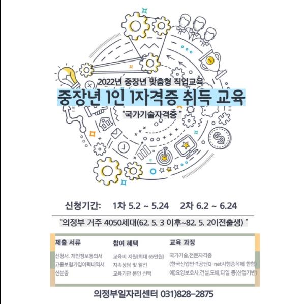 의정부시 일자리센터는 4050 중장년 세대의 재취업 및 전직 기회 확대로 국가기술자격·국가전문자격 취득을 위한‘1인 1기술 자격증 취득 교육’참여 대상자를 모집한다.