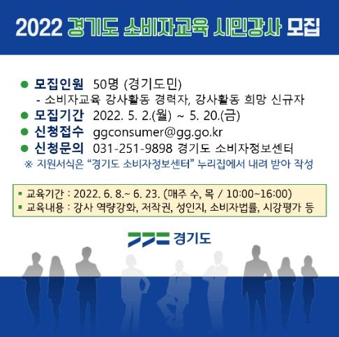 경기도가 맞춤형 소비자교육을 담당할 소비자교육 전문 강사 양성을 위해 5월 20일까지 ‘2022 소비자교육 시민강사 과정’ 참가자를 모집한다.