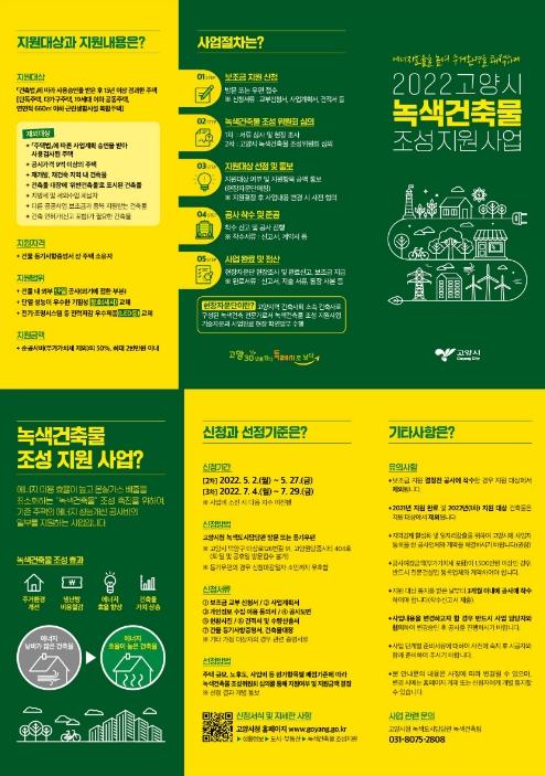 고양시가 주택의 에너지효율 향상을 통한 온실가스 배출량 감축을 위해 2022년 녹색건축물 조성 지원 사업 2차 대상자를 5월 27일까지 접수한다.