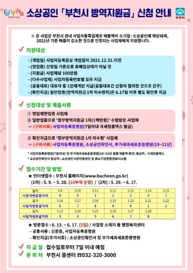 부천시는 코로나19의 장기화 및 지속적인 방역조치로 큰 경제적 손실을 입은 소기업, 소상공인 등 지역경제의 근간인 경제주체에 대한 특단의 지원대책으로 방역지원금 지원사업을 실시한다.
