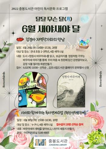 오는 6월 29일부터 30일까지 수요일 오후 14시, 목요일 오후 15시부터 1시간 30분 동안 '달달 무슨 달(月)-6월 새야새야달'을 중봉도서관 4층 세미나실에서 진행한다.