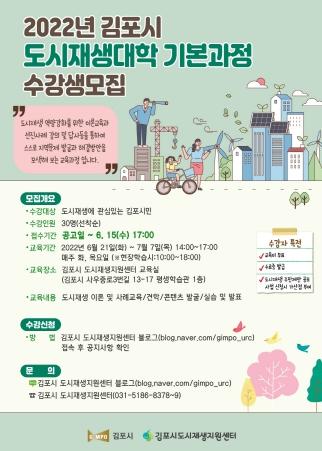 김포시 도시재생지원센터는 ‘2022년 김포시 도시재생대학 기본과정’ 수강생을 오는 6월 15일까지 모집한다.