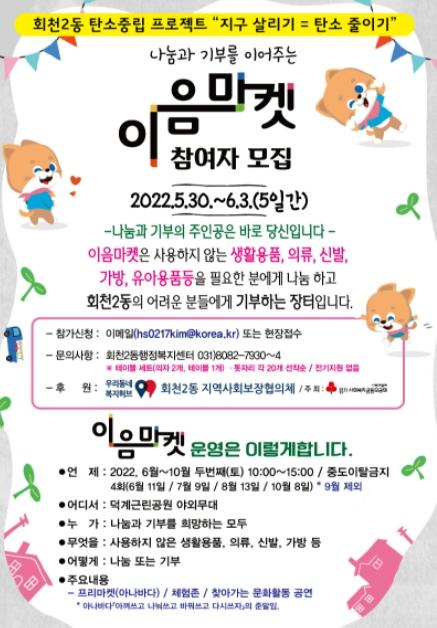 양주시 회천2동 지역사회보장협의체는 오는 30일부터 6월 3일까지 ‘이음마켓’참여자를 모집한다고 밝혔다.