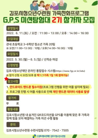 (재)김포시청소년재단 김포시청소년수련원에서는 관내 초등학교(3~6학년) 가족을 대상으로 가족 야외미션 활동을 통해 가족 간 소통과 화합의 시간을 갖는 가족친화프로그램 ‘G.P.S 미션탐험대 2기’를 운영한다.