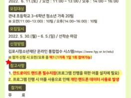 본 프로그램은 6월 11일 토요일에 운영되며, 오는 5월 30일 월요일부터 6월 5일 일요일까지 김포시청소년재단 홈페이지 통합접수스시템을 통해 참가 신청이 가능하다.