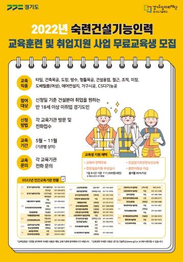 경기도일자리재단이 2022년도 건설분야 교육생 1,800명을 모집해 도내 32개 교육기관을 통해 현장 맞춤형 건설기능인력 양성에 앞장선다.