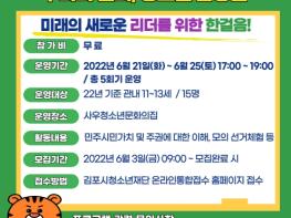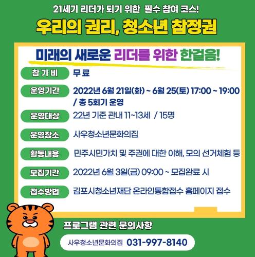 (재)김포시청소년재단 사우청소년문화의집에서는 관내 청소년들에게 민주시민가치의 개념과 청소년 참정권 이해를 돕기 위한 특성화프로그램 ‘우리의 권리, 청소년 참정권’ 1기를 운영한다.