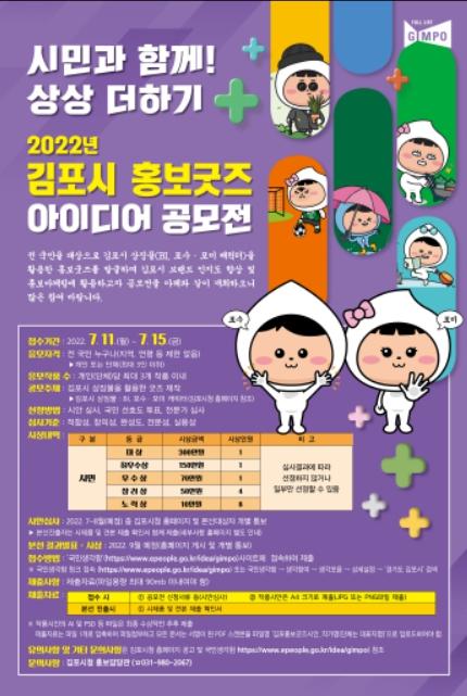 이번 공모전은 김포시 BI(Brand Identity), 포수포미 캐릭터(사진 참조) 등 상징물을 활용하여 만든 굿즈(상품)를 주제로 진행하며 김포시청 홈페이지나 국민신문고 국민생각함 사이트에서 공고가 진행 중이다.