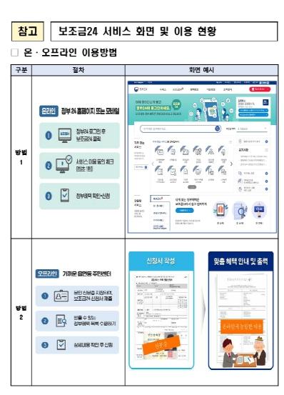 보조금24에는 중앙부처 서비스 300여 종, 자치단체 서비스 6,000여 종, 공공기관·민간단체 서비스까지 확인할 수 있으며, 인터넷 사용이 어려운 디지털 약자(노인 등)는 주민센터를 방문하여 동일한 맞춤 안내를 받을 수 있다.
