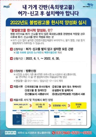 파주시는 6월 1일부터 30일까지 관련법을 인지하지 못해 미신고(허가) 된 불법광고물에 대해 한시적 양성화를 추진한다고 밝혔다.