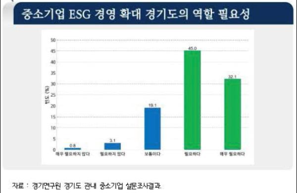 경기도 중소기업의 77.1%는 기업의 사회적 책임을 강조하는 환경·사회·투명(ESG) 경영 활성화를 위해 경기도의 지원이 필요하다고 인식한다는 조사 결과가 나왔다.