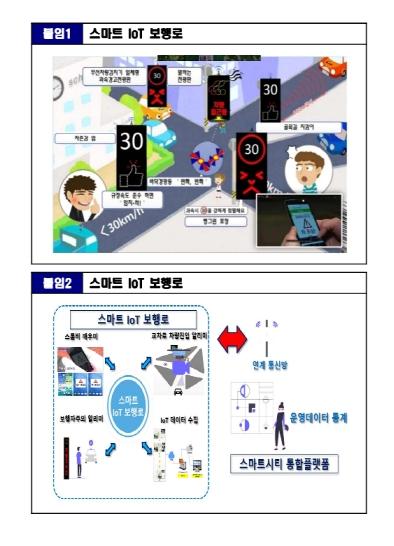 스마트 보행로는 이면도로, 어린이보호구역 등에 보행환경 개선 및 교통사고 방지를 목적으로 스마트기술을 적용해 차량 감속 유도 및LED 전광판을 통해 보행자에게는 차량접근을 알려주고 차량 운전자에게는 보행자를 알려주는 시스템이다.