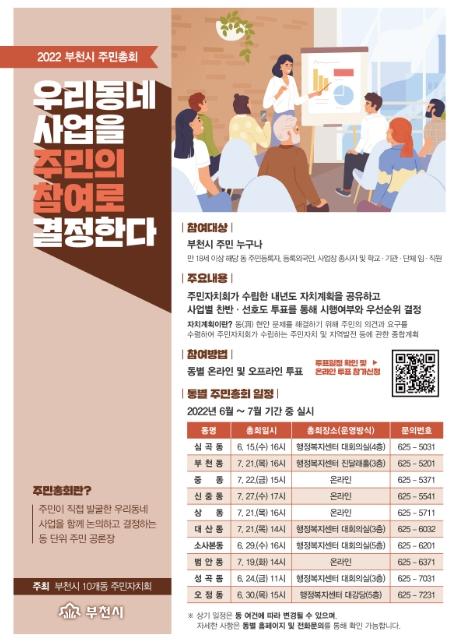 부천시는 10개 동 주민자치회가 오는 6월 15일부터 7월 27일까지 내년도 마을의제 선정을 위한 ‘2022년 주민총회’를 동별 순차적으로 개최한다고 밝혔다.