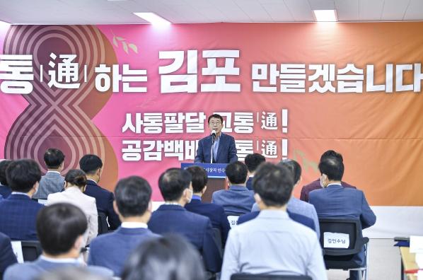 홍철호 위원장은 “인수위 사무실에 걸린 현수막을 살펴보면 ‘통(通)하는 김포 만들겠습니다, 사통팔달 교통(通), 공감백배 소통(通)’이란 슬로건이 있다”며 “이 슬로건은 민선 8기 김포시장직 인수위의 각오”라고도 했다.
