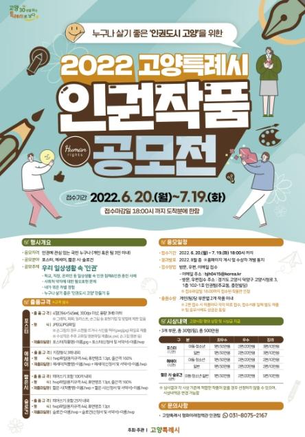 고양시가 지역사회 내 인권존중 문화를 확산하고 생활 속 인권 감수성을 향상하기 위해 ‘2022 고양특례시 인권작품 공모전’을 개최한다.