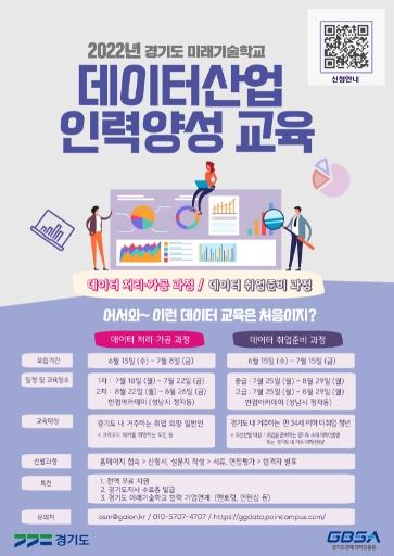 경기도와 경기도경제과학진흥원은 경기도 미래기술학교 ‘2022년 경기도 데이터 산업인력 양성교육’ 데이터 처리/가공과정 및 취업준비과정 교육생을 모집한다.