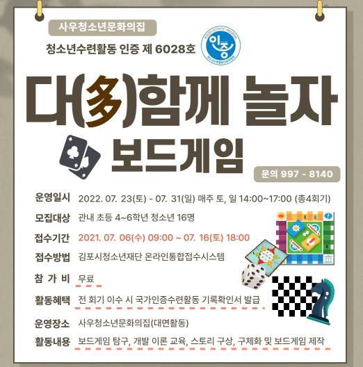 (재)김포시청소년재단 사우청소년문화의집에서는 청소년의 건전한 놀이 문화 지원과 보드게임 개발을 통해 청소년의 창의성 및 전인적 성장을 도모하기 위한 청소년수련활동인증 제6028호 ‘다(多)함께 놀자’ 프로그램을 운영한다.