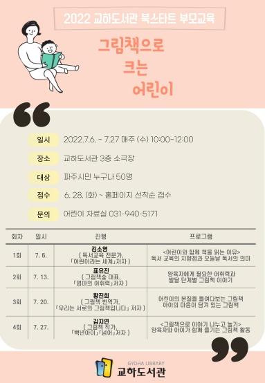 파주시 교하도서관은 오는 6일부터 27일까지 ‘그림책으로 크는 어린이’라는 주제로 북스타트 부모교육을 운영한다고 밝혔다.