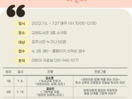프로그램은 매주 수요일 4차시에 걸쳐 진행되며, ▲1차 김소영 작가의 독서교육의 지향점과 오늘날 독서의 의미 ▲2차 표유진 작가의 양육자에게 필요한 어휘력과 발달단계별 그림책 이야기 ▲3차 황진희 그림책 번역가의 어린이의 본질을 들여다보는 그림책 ▲4차 김지연 작가의 그림책으로 이야기 나누고 놀기라는 주제를 다룬다.