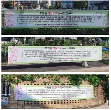감사 현수막은 지역사회 상생을 비전으로 쉼 없는 나눔 활동을 이어가고 있는 고양동지역사회협의체(민간 위원장 김준태)의 발자취를 조명하는 한편 주민에게 ‘누구나 나눔에 참여할 수 있다.’는 인식을 심어주고 있다.