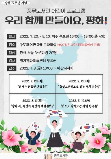 김포시 풍무도서관은 광복 77주년을 기념하여 어린이 프로그램 '우리 함께 만들어요, 평화!'를 7월 20일부터 8월 10일까지 매주 수요일 오후 4시부터 6시에 총 4회에 걸쳐 풍무도서관 3층 문화교실에서 운영한다.