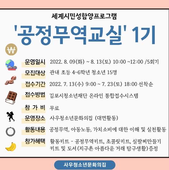 (재)김포시청소년재단 사우청소년문화의집에서는 청소년이 공정무역을 학습하고, 자기 주도적으로 공정무역 캠페인을 실천해 사회변화에 참여하는 실천형 세계시민교육 프로그램 ‘공정무역교실’ 1기를 운영한다.