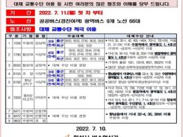 경기도는 7월 11일 첫차부터 경진여객 운수종사자의 파업이 예고됨에 따라도민의 출퇴근길 교통 불편을 최소화하기 위한 비상수송대책을 실시한다고 10일 밝혔다.