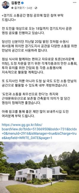 김 지사는 11일 자신의 사회관계망서비스(SNS)를 통해 “전 도민을 대상으로 오는 18일까지 경기도지사 공관 명칭 공모를 진행하고 있다”며 “당선인 신분이던 지난달 20일 밝힌 것처럼 수원시 화서동에 위치한 경기도지사 공관을 다양한 소통을 위한 만남의 공간으로 사용하려 한다”고 말했다.