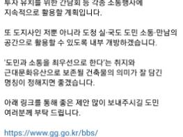 한편 경기도지사 공관은 연 면적 813.98㎡ 지하 1층·지상 2층 규모의 단독주택이다. 1967년에 완공 후 역대 도지사의 거주?업무 공간으로 쓰였고 2017년 7월 근대 문화유산으로 등록됐다. 공관 활용 방침에 따라 김 지사는 앞으로도 도의 예산지원 없이 사비로 주거지를 유지할 예정이다.