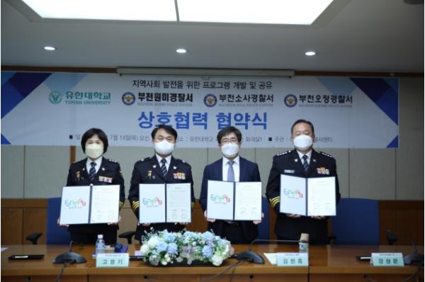 유한대학교(총장 김현중)는 부천원미경찰서, 부천소사경찰서, 부천오정경찰서와 ‘지역사회 발전을 위한 프로그램 개발 및 공유 상호협력 협약’을 유재라관 2층 회의실에서 체결했다.