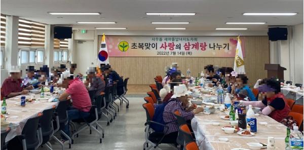 사우동남녀새마을지도자회는 초복을 맞이하여 지난 14일 관내 저소득 어르신 100여명을 초청하여 “어르신을 위한 사랑의 삼계탕 나누기” 행사를 개최했다.