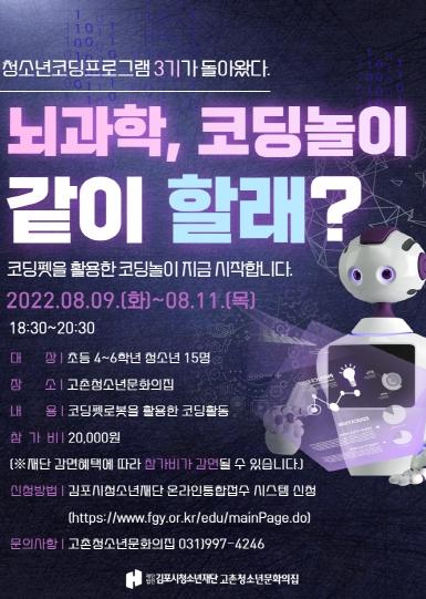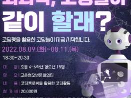 청소년 코딩 프로그램은 초등학령기 청소년 4~6학년 15명 대상, 대면 프로그램으로 8월 9일(화) ~ 8월 11일(목) 18:30 ~ 20:30 진행한다. 프로그램의 내용은 로봇펫을 활용한 코딩활동이 진행된다.