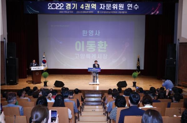 이동환 고양특례시장이 민주평통 경기북부 4권역 자문위원 연수에 참가해 인사말을 전하고 있다.