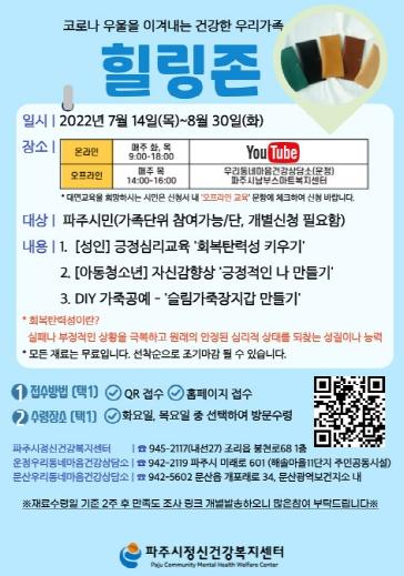 대면 프로그램은 7월 21일부터 8월 25일까지 매주 목요일 14시부터 16시까지이며, 파주시 남부스마트복지센터 1층(해솔마을11단지 내 주민공동시설)에서 진행하므로, 참여를 원하는 시민은 8월 19일 금요일까지 센터 홈페이지에 신청하면 된다.
