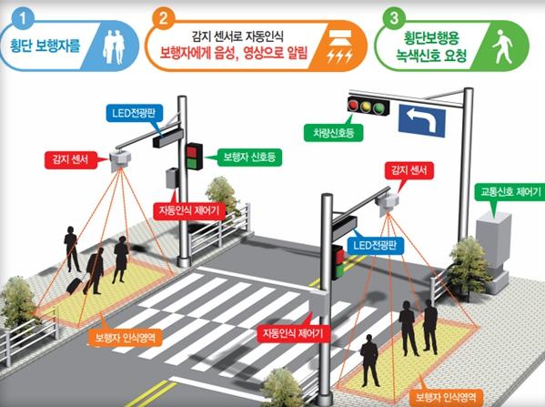 보행자 자동인식 시스템은 횡단보행자가 횡단보도 앞 보행자 인식영역에 대기를 하면 보행자 작동 신호기의 버튼을 누르지 않아도 자동으로 보행자의 유무를 감지해 보행신호를 부여하고 보행신호의 상태를 전광판과 음성으로 제공해 안전하고 편리한 보행환경을 제공하기 위한 시스템이다.