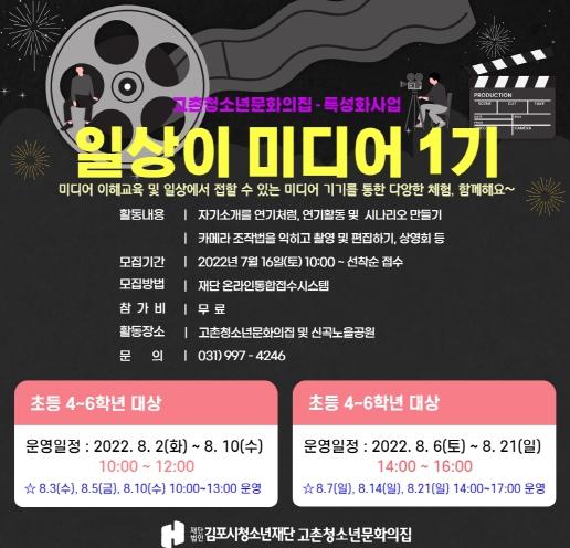 (재)김포시청소년재단 고촌청소년문화의집에서는 미디어 특성화시설로 자리매김 하기 위하여 청소년들의 미디어에 관련된 특기와 소질을 개발 할 수 있도록 특성화사업 ‘일상이 미디어 - 2기’ 프로그램을 운영한다.