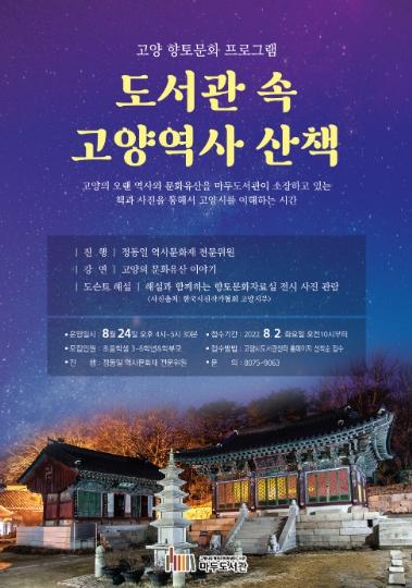 고양특례시 마두도서관이 8월 24일(수) 도서관 강의실 및 향토문화자료실에서‘도서관 속 고양역사 산책’을 운영한다. 강의는 초등학교 3학년 이상의 고양시민이면 누구나 들을 수 있다.