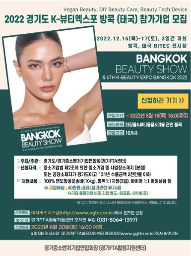 경기도와 경기지역FTA활용지원센터(이하 경기FTA센터)는 오는 12월 15~17일, 3일간 태국에서 열리는 ‘2022 K-뷰티 엑스포 방콕’에 참가할 도내 유망 뷰티 관련 소비재 기업을 모집한다고 1일 밝혔다.