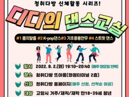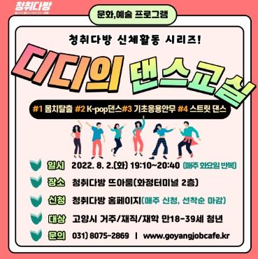 고양특례시가 청년들의 취업 스트레스 해소를 위한 문화예술 프로그램을 추진한다. 고양시 청취다방(청년과 취업을 위한 수다방)이 선보이는 2022년 하반기 첫 번째 프로그램은 댄스 프로그램이다.