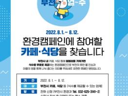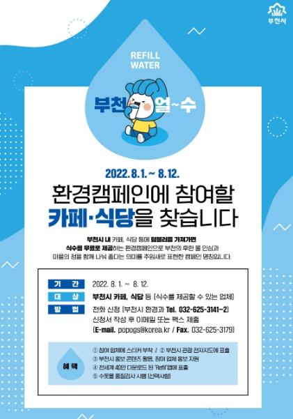 부천시는 ‘부천 얼~水’ 캠페인 본격 가동에 앞서 참여할 카페와 식당을 오는 8월 12일까지 모집한다고 밝혔다.