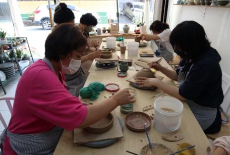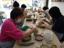 ‘도자기 사랑’은 김복자 대표 등 8인으로 구성된 원미지역 주민제안 공모사업팀으로, 흙을 만지며 컵과 접시 등을 빚고 결과물의 일부를 원미마을카페에 기부하고 있다.