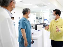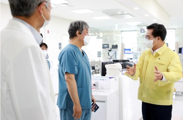 김동연 경기도지사가 1일 코로나19 재유행에 대응하기 위해 성남시의료원 감염병전담병상과 수정구보건소 선별진료소를 찾아 현장을 점검하고 의료진과 직원들을 격려했다.